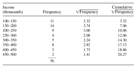 Example 3: An investigator wishes to estimate the average yearly sales for 56 firms, using a sample of \(n=15\) firms. Frequency data on these firms is available in the form of classification by \(\$ 50,000\) increments and appears in the accompanying table. How can we best allocate the firms to \(L=3\) strata?![]()