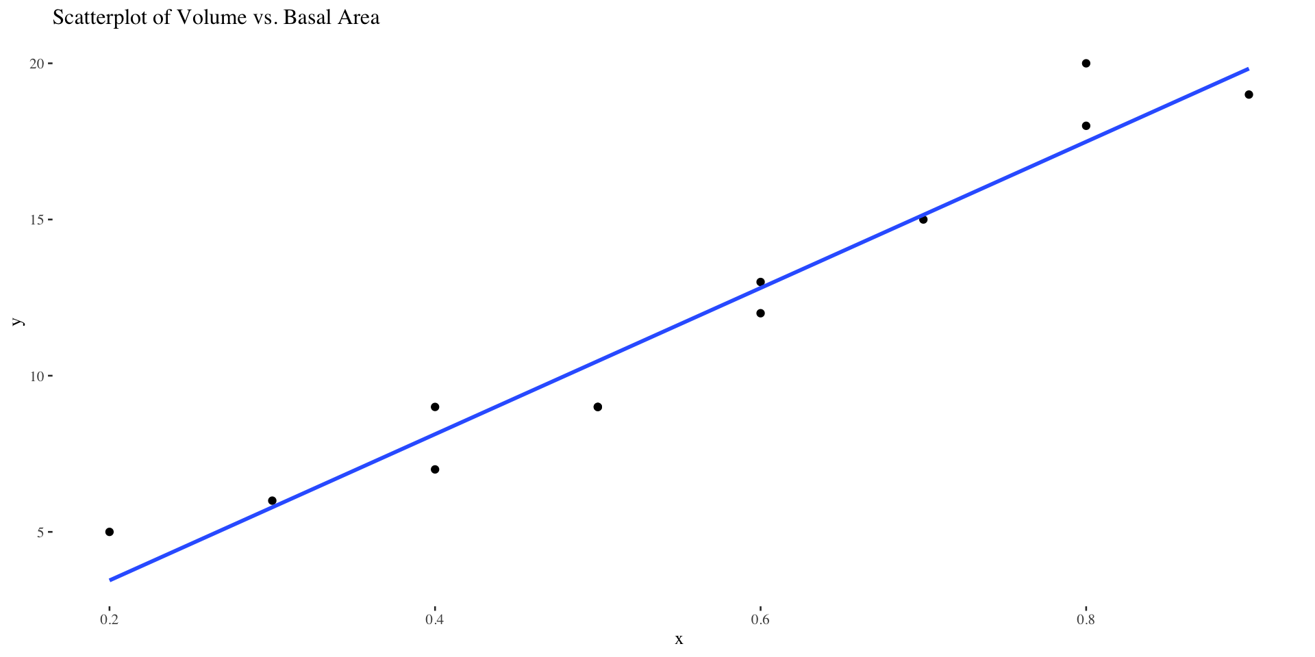 labs(title = "Scatterplot of Volume vs. Basal Area",