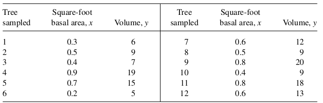 Example 1: (Textbook Ex 6.1) A forester is interested in estimating the total volume of trees in a timber sale. He records the volume for each tree in a simple random sample. In addition, he measures the basal area for each tree marked for sale. He then uses a ratio estimator of total volume. The forester decides to take a simple random sample of \(n=12\) from the \(N=250\) trees marked for sale. Let \(x\) denote basal area and \(y\) the cubic-foot volume for a tree. The total basal area for all 250 trees, \(\tau_x\), is 75 square feet. Use the data in the accompanying table to estimate \(\tau_y\), the total cubic-foot volume for those trees marked for sale, and place a bound on the error of estimation.