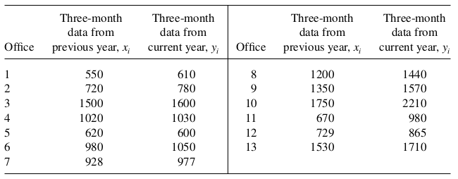 x = "Basal Area", y = "Volume")Example 2: (Textbook Ex 6.4) A corporation is interested in estimating the total earnings from sales of color television sets at the end of a three-month period. The total earnings figures are available for all districts within the corporation for the corresponding three-month period of the previous year. A simple random sample of 13 district offices is selected from the 123 offices within the corporation. Using a ratio estimator, estimate \(\tau_y\) and place a bound on the error of estimation. Use the data in the accompanying table and take \(\tau_x=128,200\)