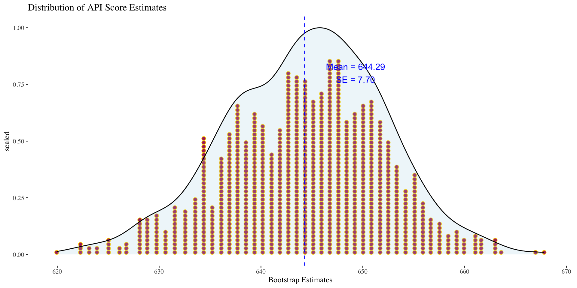 # Calculate mean and SEbootstrap_mean <-mean(estimate_values)bootstrap_se <-sd(estimate_values) # Plotting the bootstrap estimateslibrary(ggplot2)ggplot(data =data.frame(estimate_values), aes(x = estimate_values)) +geom_dotplot(binwidth =0.8, stackdir ="up", dotsize =0.5, fill ="maroon", col ="gold") +geom_density(aes(y = ..scaled..), fill ="lightblue", alpha =0.2, adjust =1) +geom_vline(xintercept = bootstrap_mean, color ="blue", linetype ="dashed") +annotate("text", x = bootstrap_mean +5, y =0.8, label =sprintf("Mean = %.2f\nSE = %.2f",bootstrap_mean, bootstrap_se), color ="blue") +xlab("Bootstrap Estimates") +ggtitle("Distribution of API Score Estimates")